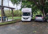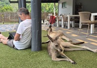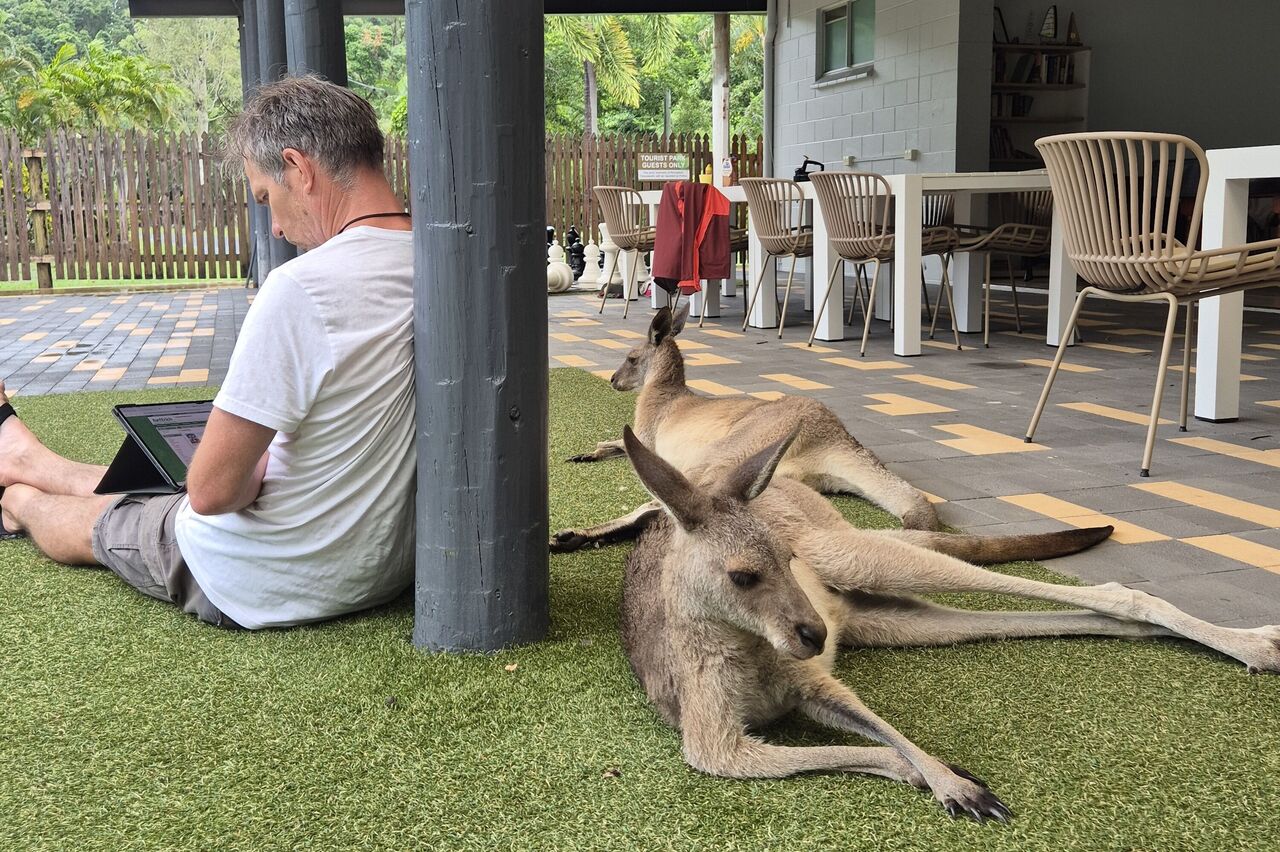 Wir fahren ein paar hundert km, es wird immer dunkler, die ersten Schauer fallen. Laut Wetterbericht kommen ein paar nasse Tage auf uns zu. Egal, wir sind ja nicht aus Zuckerwatte. Kurz vorm Tagesziel merken wir, das wir sehr abgelegen sind. Im gefühlt letzten Örtchen halten wir nochmal zum Milch holen, dann ist 20 km Dschungel vor uns. Es ist halt Nationalpark, da ist nur Natur. Am Campingplatz werden wir von Aras und Kängurus begrüßt. Auch ein Pool ist vorhanden, Gäste sind nicht so viele. Internet ist alle.